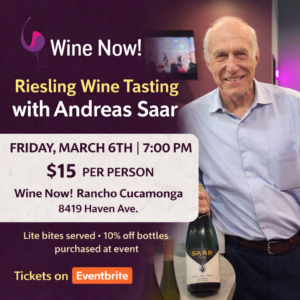 Riesling Wine Tasting with Owner Andreas Saar Join us for a special evening at Wine Now! as we welcome Andreas Saar, owner and curator of an exceptional Riesling collection. On Friday, March 6th at 7PM, guests will enjoy a guided tasting of several Riesling wines while learning about the wines, the regions, and what makes…