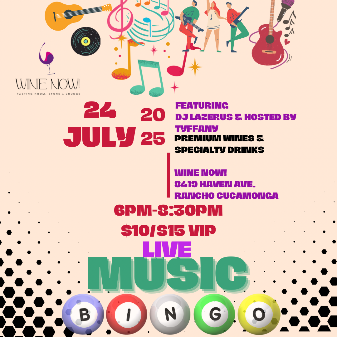 Get ready for a night of fun, music, and prizes at Wine Now! Join us for Musical Bingo, where your favorite songs become your winning ticket. DJ Lazarus will be spinning the hits while you sip on great wine and enjoy the vibes.