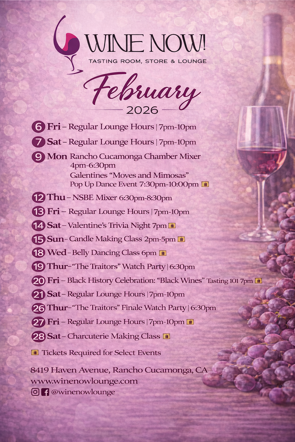 February Schedule and Events at Wine Now! + Add to Google Calendar + iCal / Outlook export Date Feb 06 - 28 2026 Ongoing... Time All Day