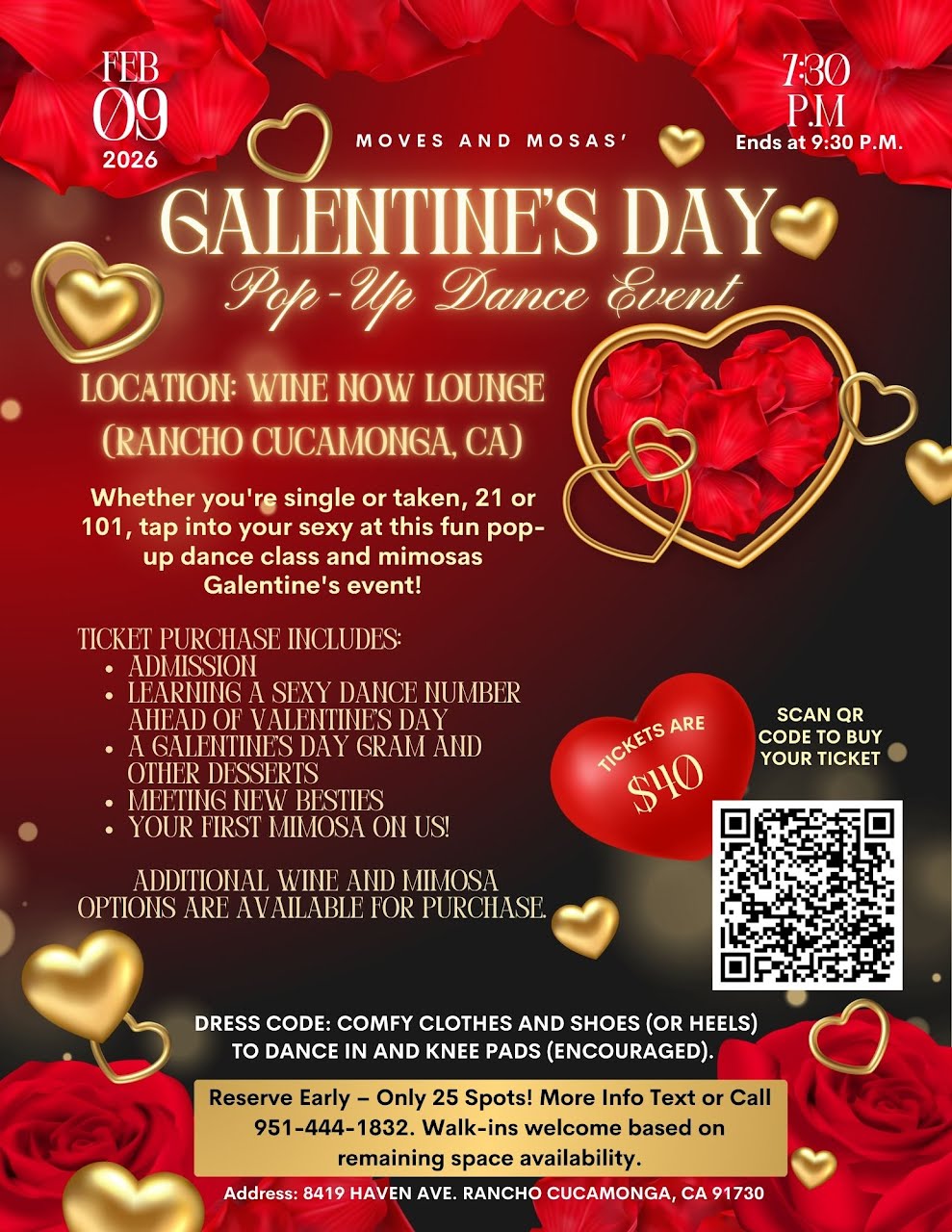 Ticket purchase includes admission, learning a sexy dance number ahead of Valentine’s Day, a Galentine’s Day gram and other fun goodies, meeting new besties, and your first mimosa on us! Additional wine and mimosa options are available for purchase.