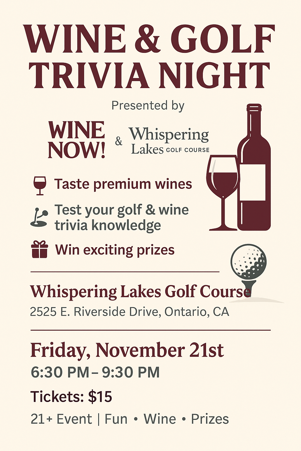 Presented by Wine Now! & Whispering Lakes Golf Course